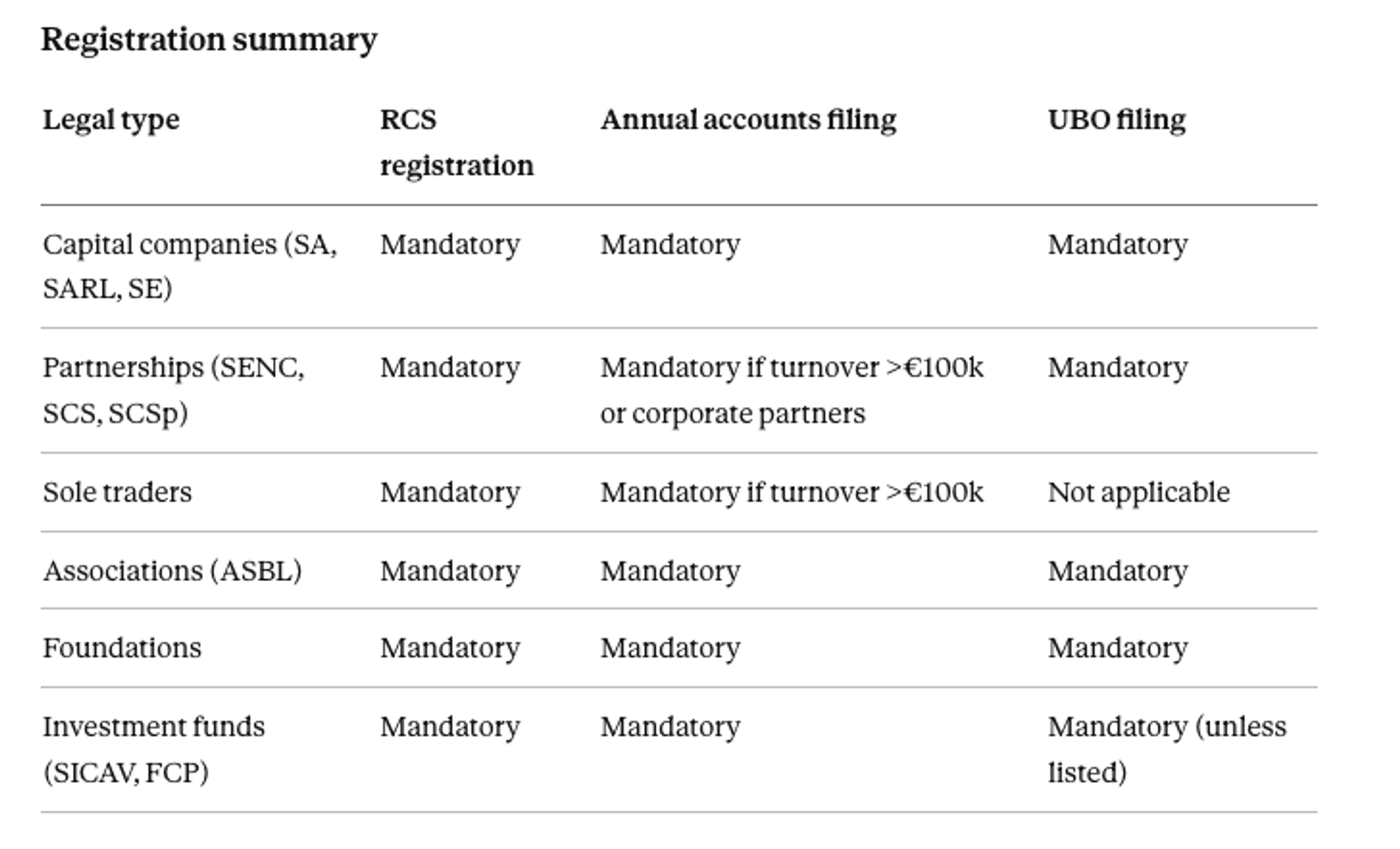 Registration with the RCS is mandatory for all commercial companies upon incorporation. This includes: public limited companies (SA), private limited companies (SARL and SARL-S), partnerships limited by shares (SCA), general partnerships (SENC), limited partnerships (SCS and SCSp), cooperative companies, European companies (SE), and civil companies.