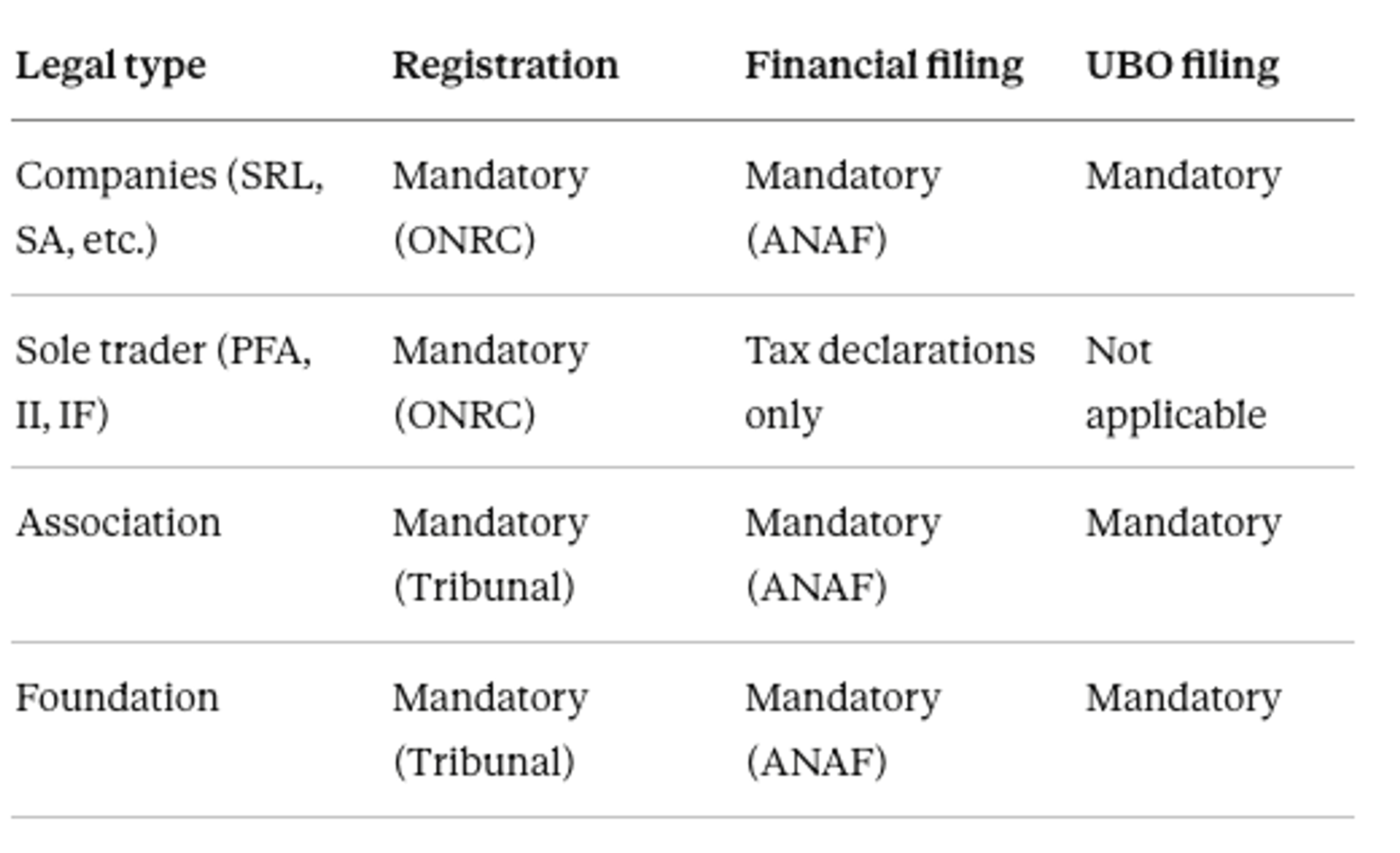 Sole traders must maintain bookkeeping records and file annual tax declarations with ANAF but are not required to file annual financial statements with the Trade Register. UBO requirements do not apply to sole traders, as they are natural persons.